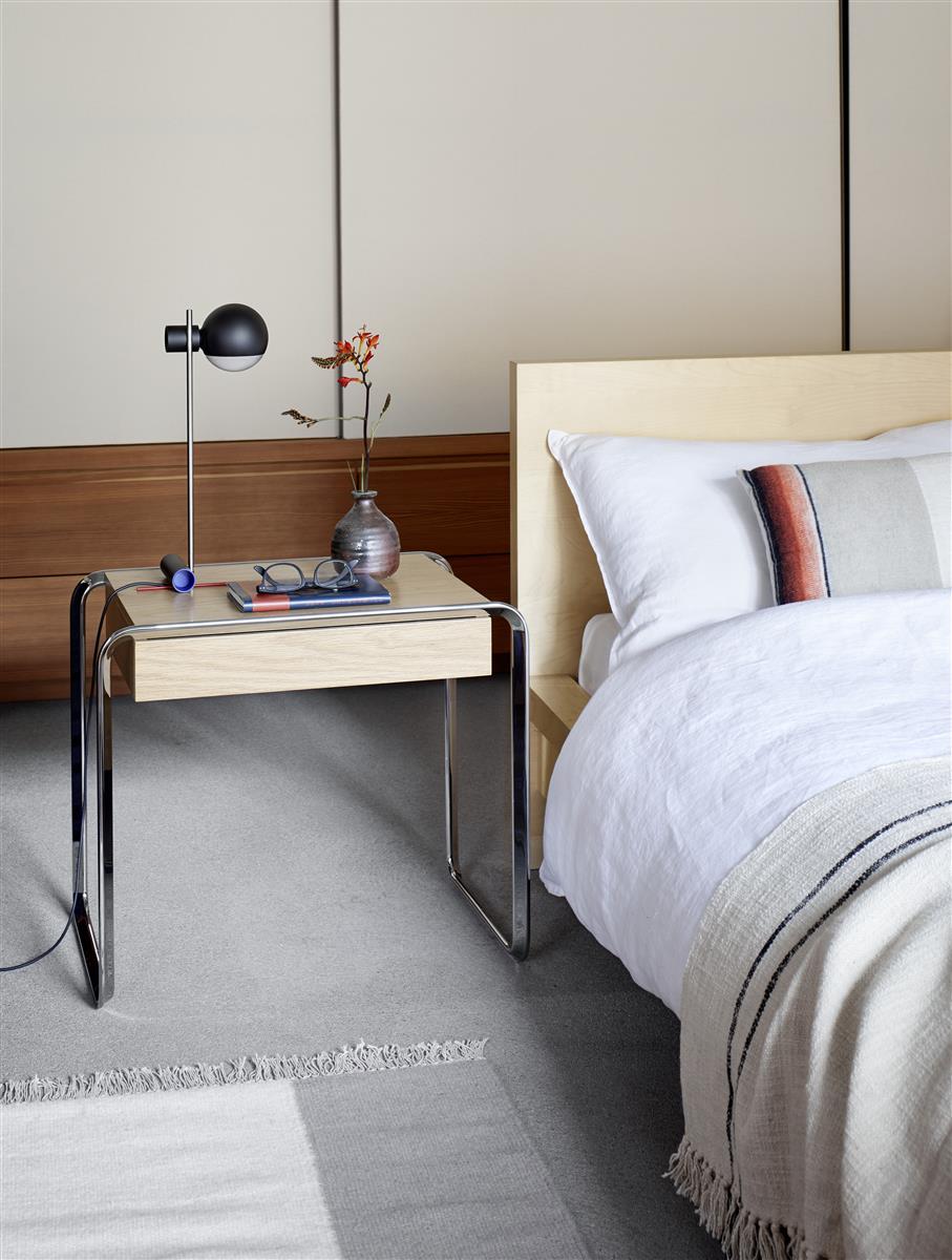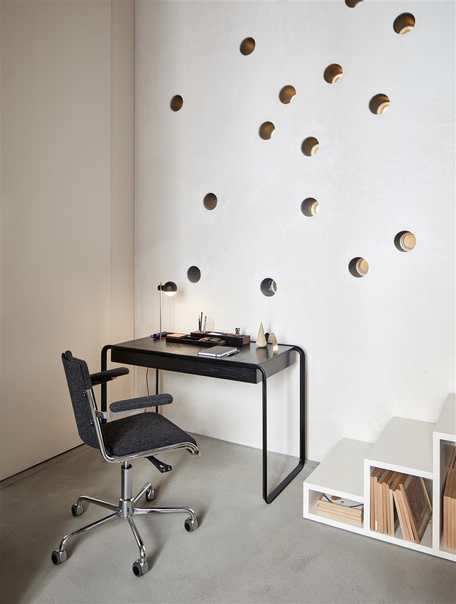 Ein bisher nicht geborgener Schatz ist die kleine Tafellampje von Rietveld. Eine Tischleuchte, die er 1925 in streng geometrischen Formen entwarf. Überraschend modern in ihrer Zeit, wurde sie bisher nie in Serie produziert. Nach Gesprächen mit den Rietveld-Erben nahm sich Tecta der Leuchte an. Die exakten Maße der Originalzeichnung wurden Ausgangspunkt der kleinen, feinen Produktion.